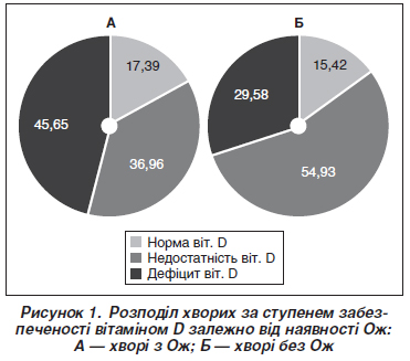 Актуальність. На сьогодні встановлено факт і механізми асоціативних зв’язків між дефіцитом вітаміну D і первинним гіперпаратиреозом (ПГПТ). Відомо, що на рівні 25(ОН)D впливають кліматичні умови та наявність ожиріння (Ож). Вказане визначило мету дослідження — встановити забезпеченість вітаміном D хворих із ендокринною патологією, що мешкають в умовах клімату України, та оцінити вплив Ож на рівні вітаміну D і розвиток гіперкальціємії — ознаки ПГПТ. Матеріали та методи. У 145 хворих, які знаходились в ендокринологічній клініці з приводу різної ендокринної патології, досліджено ІМТ, рівні кальцію (Са) та вітаміну D у сироватці крові. Проаналізовано частоту недостатності та дефіциту вітаміну D, гіперкальціємії у групах з ожирінням та без нього. Результати. Частка хворих із ожирінням у загальній групі становила 33,8 %, серед чоловіків — 28,57 %, серед жінок — 35,04 % (p < 0,05). Рівень Са в крові був 2,39 ± 0,02 ммоль/л, гіперкальціємія відзначалася в 16,55 %, а Ож — у 49 (33,49 %) хворих. На тлі Ож рівень Са становив 2,42 ± 0,02, а в осіб без ожиріння — 2,38 ± 0,02 (p > 0,05). Середній рівень вітаміну D у крові у загальній групі становив 22,95 ± 0,73 мг/мл та був вірогідно нижчим в осіб з Ож (20,95 ± 1,39 мг/мл проти 24,09 ± 0,81 мг/мл у групі без Ож, p < 0,05). Розподіл хворих залежно від ступеня забезпеченості вітаміном D показав, що в когорті зі зниженою забезпеченістю вітаміном D та наявністю Ож підгрупа з дефіцитом вітаміну D (20–29 нг/мл) була майже вдвічі більшою, ніж підгрупа без Ож. Таким чином, наявність Ож у хворих із ендокринною патологією не має вірогідного впливу на частоту гіперкальціємії, але асоціюється з вірогідним зниженням рівня вітаміну D у крові з перевагою у підгрупі з дефіцитом вітаміну D, у той час як у групі без Ож спостерігається перевага недостатності вітаміну D. Висновки. У кліматичних умовах України у хворих з ендокринною патологією середній рівень забезпеченості вітаміном D знаходиться у межах його недостатності (22,95 ± 0,73 нг/мл). Наявність ожиріння у хворих з ендокринною патологією асоціюється з вірогідно більш низькою забезпеченістю вітаміном D, зростанням майже вдвічі кількості осіб з дефіцитом вітаміну (< 20 нг/мл). У хворих з ендокринною патологією поєднання ожиріння і дефіциту вітаміну D слід розглядати як чинник ризику первинного гіперпаратиреозу. Такі хворі потребують регулярного контролю рівня кальцію крові та паратгормону, а також медикаментозної підтримки забезпеченості вітаміном D.