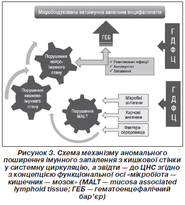 Механізм розвитку і поширення запалення в організмі дітей з РАС, асоційованими з ГДФЦ, починаючи з дисбіозу кишечника і ураження кишкової стінки і закінчуючи інтрацеребральним запаленням з формуванням аберантних міжнейронних зв’язків у ЦНС, ми пропонуємо уявити у вигляді наступної схеми (рис. 3).