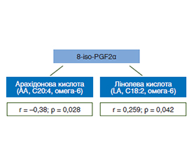 3. За результатами кореляційного аналізу встановлено вірогідний зворотний зв’язок між рівнем 8-iso-PGF2α та вмістом арахідонової кислоти у сироватці крові (r = –0,33; p = 0,028), що вказує на специфічне перетворення омега-6 ПНЖК у неферментативному ізопростаногенезі.