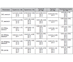 Background. Cardiovascular-kidney-metabolic syndrome (CKMS) is a multifactorial pathological condition, the pathogenesis of which combines mutually reinforcing mechanisms of cardiovascular, renal and metabolic disorders that significantly increases the risk of progression of coronary heart disease (CHD), type 2 diabetes mellitus (T2DM) and chronic kidney disease (CKD). The aim of the study was to compare blood lipids in patients with cardiovascular-kidney-metabolic syndrome depending on its stage and the presence of type 2 diabetes mellitus. Materials and methods. All patients with CKMS underwent a general clinical examination with confirmation of the diagnosis of T2DM and CHD. They were divided into six main clinical groups depending on the presence/absence of CHD and T2DM (taking into account the degree of compensation), as well as a control group. The study was conducted in four stages: analysis of lipid metabolism in patients with CKMS without CHD and T2DM, study of blood lipids in patients with CKMS in the presence of CHD, assessment of lipid profile in patients with CKMS and T2DM, analysis of changes in lipid metabolism in CKMS in the presence of CHD and T2DM. Results. In patients with CKMS without CHD and T2DM, there was a significant increase in triglycerides (TG), very low-density lipoprotein (VLDL) cholesterol, indicating an early activation of atherogenesis. In the combination of CKMS with CHD, changes in lipid metabolism are more pronounced — total and low-density lipoprotein (LDL) cholesterol increases, and high-density lipoprotein (HDL) cholesterol decreases. In patients with CKMS with T2DM, regardless of the level of compensation, there was an increase in TG, total and VLDL cholesterol compared to the control group, with the highest values of these parameters noted in T2DM decompensation combined with CHD. In the presence of CKMS, nonspecific atherogenic changes in the lipid levels occur, which progress with the addition of CHD and/or T2DM that creates a high proatherosclerotic threat. Conclusions. In patients with CKMS without CHD and T2DM, lipid disorders are detected in the form of a significant increase in TG, VLDL cholesterol and atherogenic index, which indicates the activation of atherogenesis. In patients with CKMS and CHD, the progression of insulin resistance is accompanied by more pronounced disorders of lipid metabolism — a significant increase in TG and VLDL cholesterol, as well as an increase in total cholesterol by 12.7 % (p = 0.001), LDL cholesterol by 20.37 % (p = 0.002) and a decrease in HDL cholesterol by 28.8 % (p = 0.0009). The presence of T2DM in patients with CRMS, regardless of the degree of its compensation, is associated with a probable increase in TG, total and VLDL cholesterol, and atherogenic index. Patients with CKMS are characterized by the dependence of the degree of atherogenic changes in lipoproteins on the presence and severity of CHD, as well as on the state of T2DM compensation.